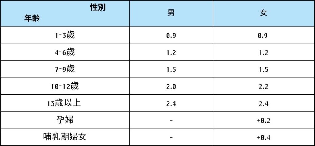 「國人膳食營養素參考攝取量」第八版 維生素B12每日建議攝取量((μg微克)