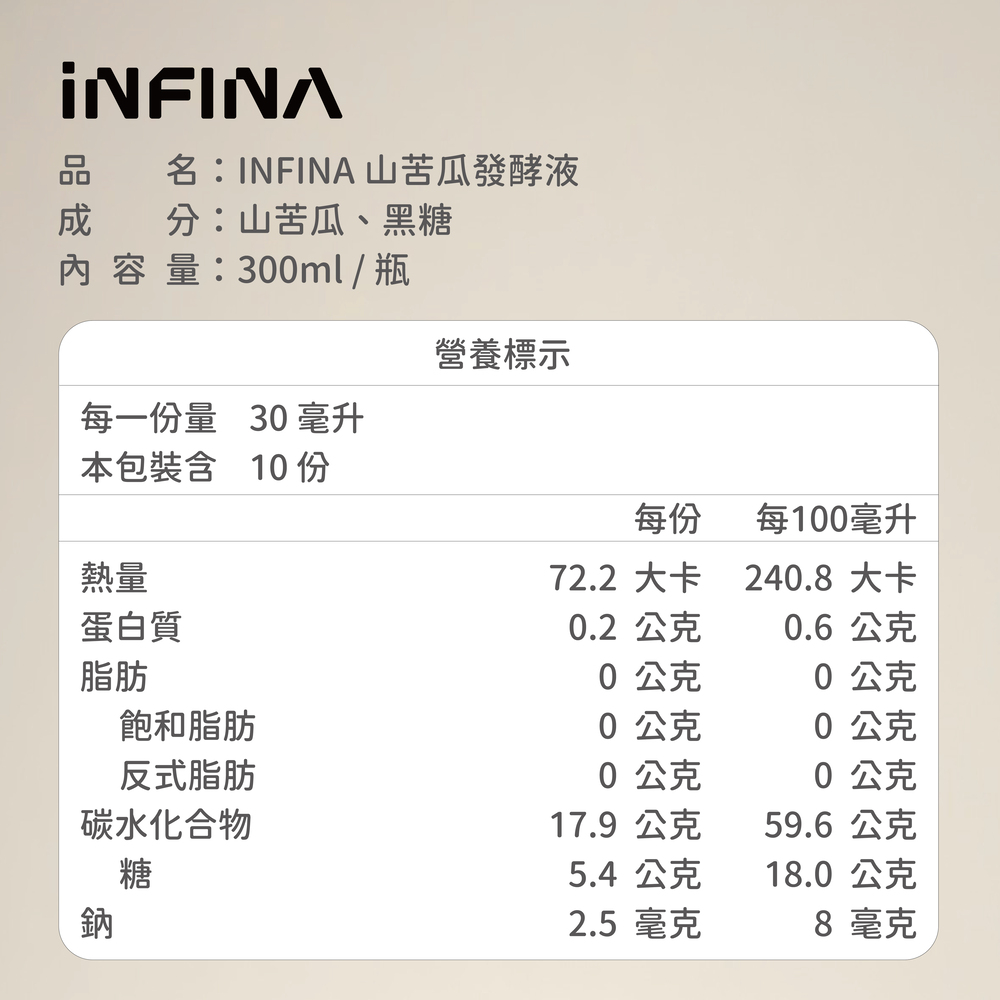 商品名稱 INFINA 山苦瓜發酵液 成分 山苦瓜、黑糖 商品原產地 台灣 保存期限 未開封三年 保存方式 請放置陰涼處避免太陽直射 有效日期 請詳見產品包裝標示(製造日期會因庫存批次而有所不同) 負責廠商 祐昇生技行銷股份有限公司 製造廠商電話 03 4850369 製造廠商地址 桃園市楊梅區梅高路441巷31號 食品業者登錄字號 H-153496923-00000-6 販售規格 300ml/瓶 注意事項 本產品非醫療產品,不具醫療效能 本產品請放置兒童接觸不到的地方 本產品若有使用不適,應立即停用或盡速就醫 此產品經拆封使用恕不接受退換貨 商品評價 目前沒有評價。 搶先評價 “INFINA 山苦瓜發酵液 300ml/瓶”取消回覆Login with your Social ID發佈留言必須填寫的電子郵件地址不會公開。 必填欄位標示為 *您的評分 * 評分… 完美 很好 一般 不錯 很差 名稱 *電子郵件 *您的評價 * 在瀏覽器中儲存顯示名稱、電子郵件地址及個人網站網址,以供下次發佈留言時使用。 送出